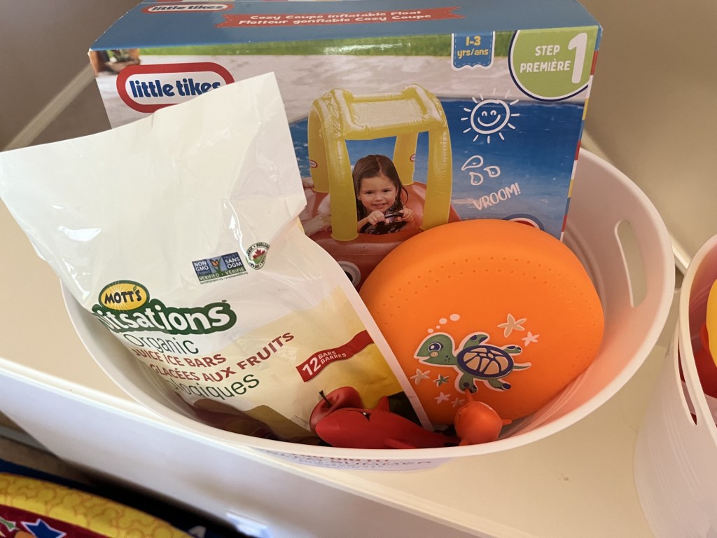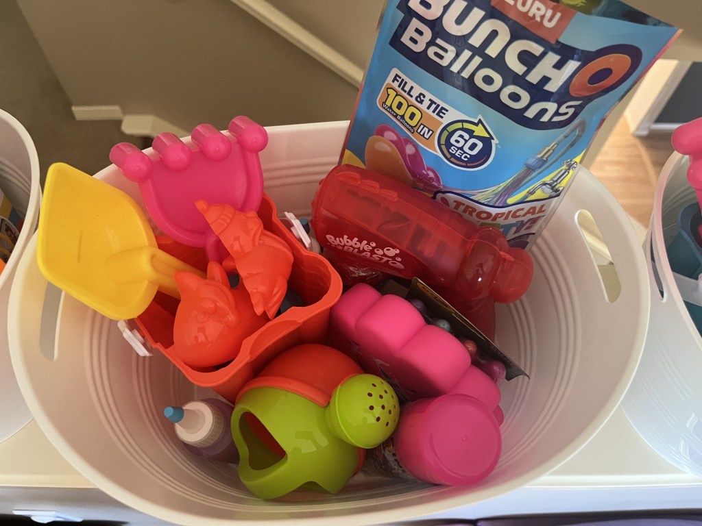 Dollar store finds! The white buckets are from the dollar store. The fun stuff inside the buckets are finds from Walmart & Michaels. These buckets are for a preschooler, toddler and a baby.